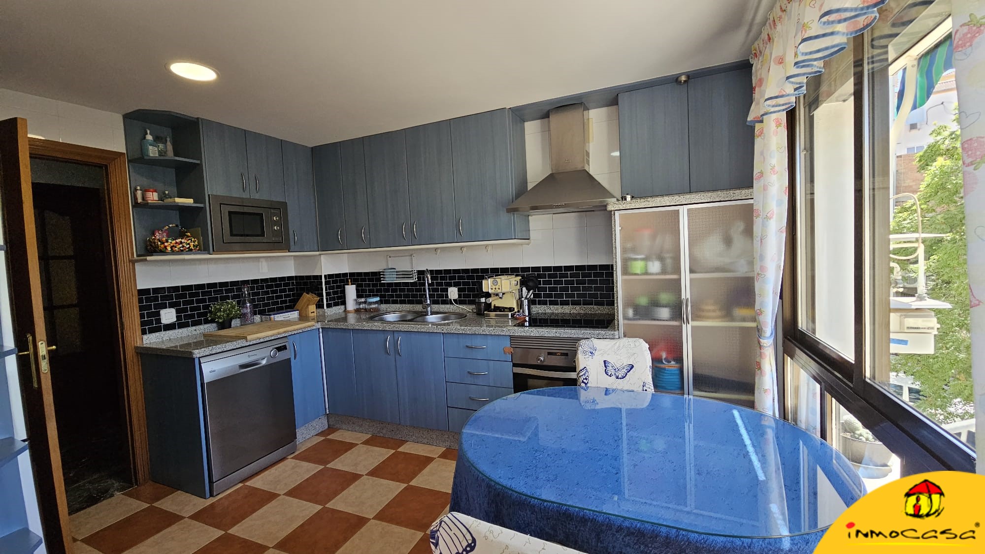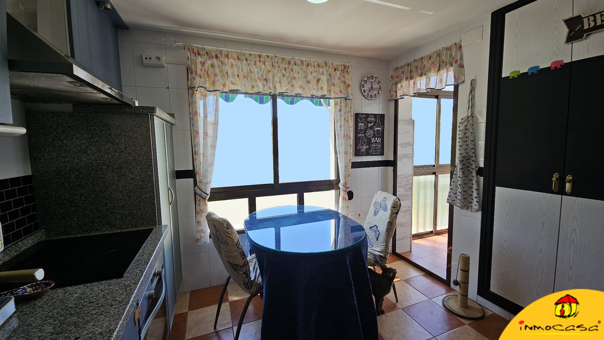 El piso tiene una superficie construida de 116 metros cuadrados y consta de tres dormitorios, dos baños (uno completo con bañera y el otro con bañera pero usado como lavadero), una cocina totalmente equipada con una terraza acristalada y un amplio salón con máquina de aire acondicionado y salida a un buen balcón.